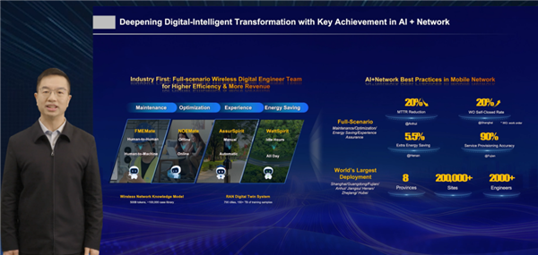 能力上实现网络资源自动调配,河南5G基站单站节能增益提升,福建高价值业务体验显著优化;交互上完成从命令行到自然语言的转变,安徽网络故障修复时长缩短20%;流程上推动运维从人被动响应到流程主动驱动,上海无线网络优化自闭环率提升15%。